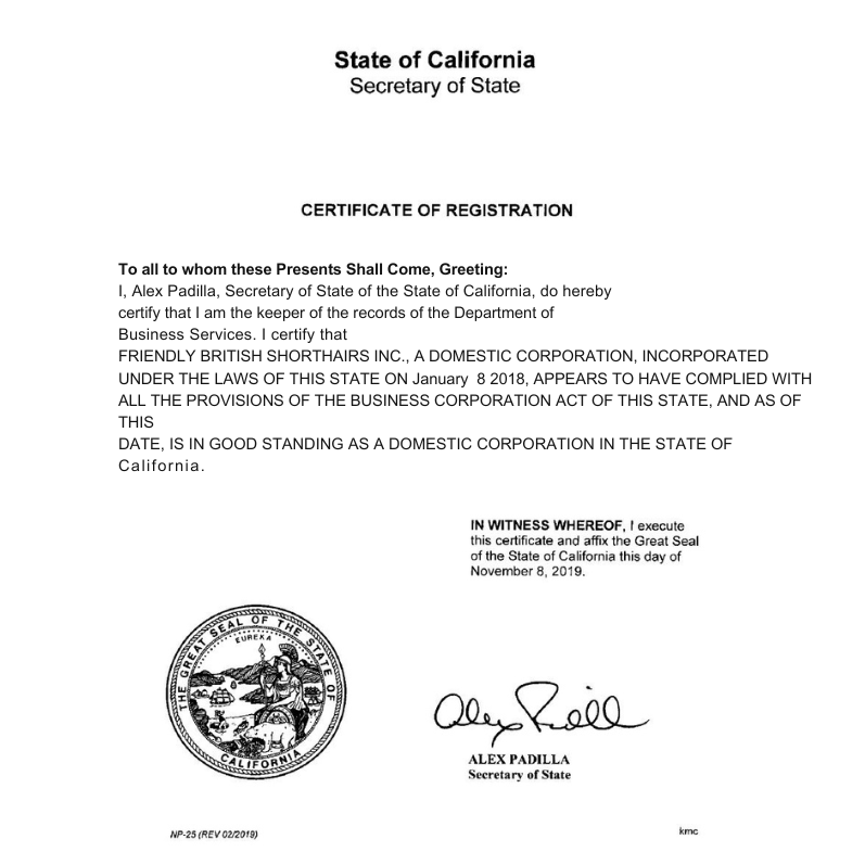 - State Registration: Friendly British shorthair is officially registered with the California Department. This ensures that we are operating under the legal guidelines set by the state. Proof of our business registration can be produced upon request.